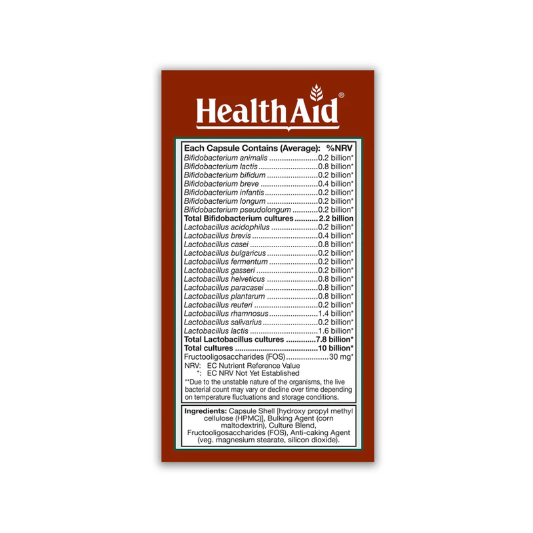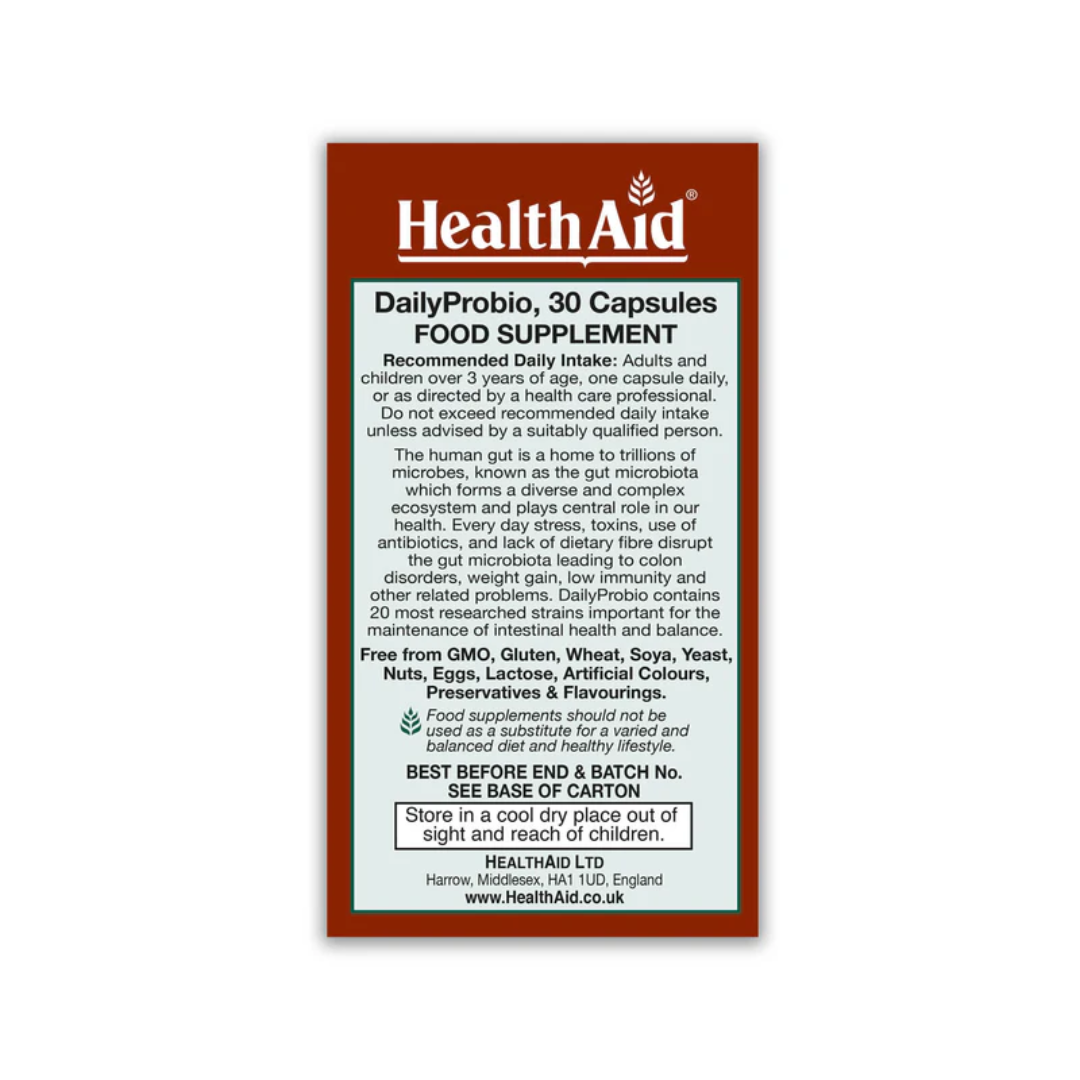 HealthAid® DailyProbio helps to supplement your diet by replenishing 'friendly' bacteria, supporting the immune system and aiding in the absorption of nutrients within the gut by providing 20 different strains of Lactobacillus and Bifidobacterium (live microorganisms). Fructo-oligosaccharides (FOS), a prebiotic, is added to help support the growth of 'friendly' bacteria in the intestinal tract.