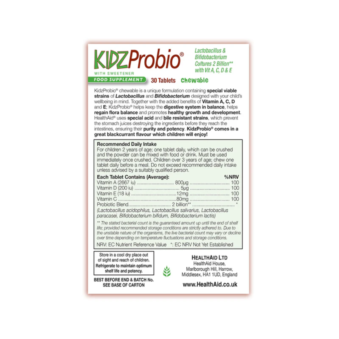 HealthAid® KidzProbio™ Tablets help increase 'friendly' bacteria, support the immune system and aid in the absorption of nutrients within the gut by providing 2 billion special strains of Lactobacillus and Bifidobacterium (live microorganisms). KidzProbio™ contains Fructo-Oligosaccharides (FOS), an added prebiotic to help support the growth of 'friendly' bacteria in the intestinal tract. It is also rich in vitamins A, D, E and C which play a crucial role in promoting children's health and well-being.