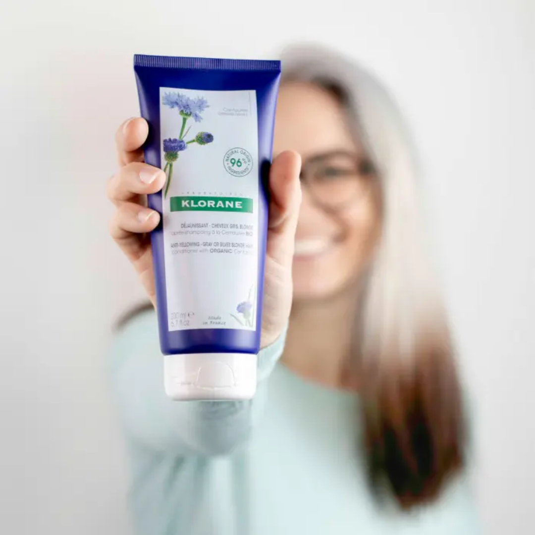 CENTAUREA BIO, a source of cyanocentaurein and a plant-based pigment with purple-blue hues traditionally used to give platinum white or gray hair a beautiful silvery shine. Real care with a softening action, the formula of Klorane anti-yellowing balm coats the hair with delicate cool reflections. Soft and easy to comb, the hair reveals all its beauty and shine.