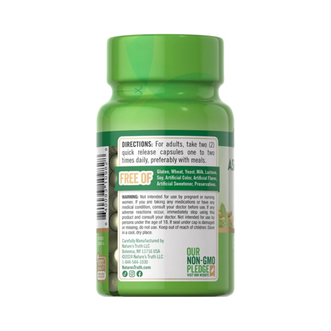 The Ashwagandha supplement is non-GMO and does not contain gluten, wheat, yeast, milk, lactose, soy, artificial colors, artificial flavors, artificial sweeteners, and preservatives.