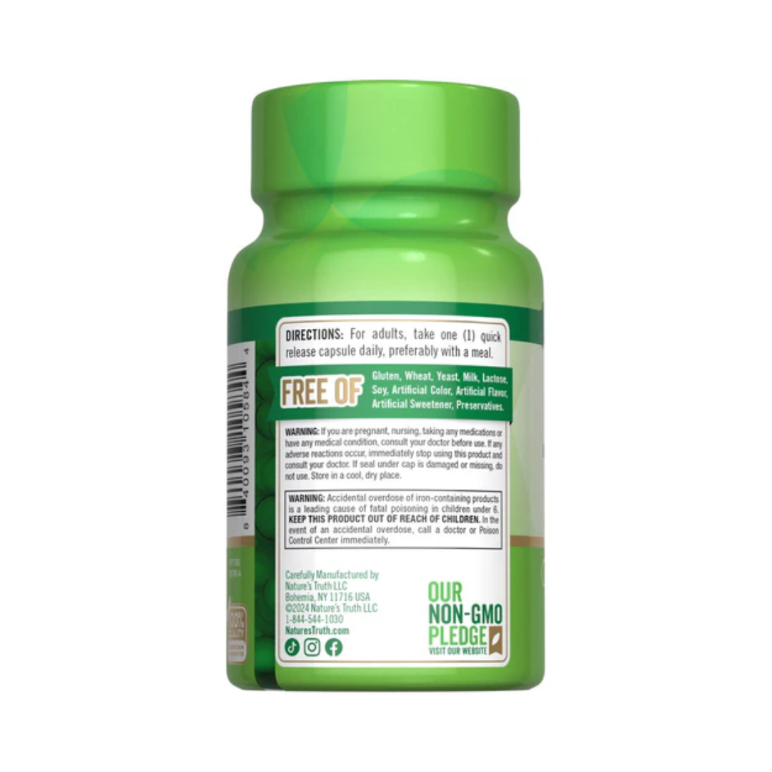 Nature's Truth has created a high-quality iron supplement (as Iron Bisglycinate) that is gentle on your stomach! The quick-release capsules provide 28 mg of this essential mineral per serving.