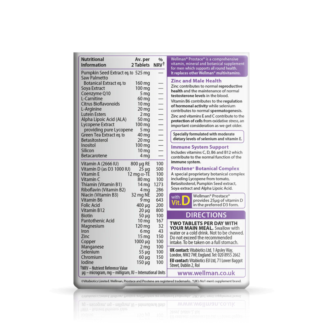 Wellman Prostace is a complete multi-nutrient formula that helps support overall male health and vitality, including specific ingredients like zinc, which contributes to normal reproductive health.