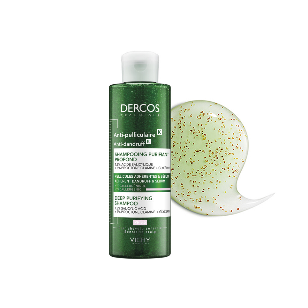 Vichy Dercos Anti-Pelliculaire K është një shampo me veprim të dyfishtë për të luftuar zbokthin dhe për të qetësuar kruajtjen e skalpit. Kjo shampo është formuluar me përbërës aktivë si Selenium DS dhe Cohesyl, të cilët ndihmojnë në eliminimin e zbokthit të dukshëm dhe parandalojnë rishfaqjen e tij. Njëkohësisht, formula e saj qetëson skalpin dhe redukton ndjesinë e kruajtjes që shoqëron zbokthin.