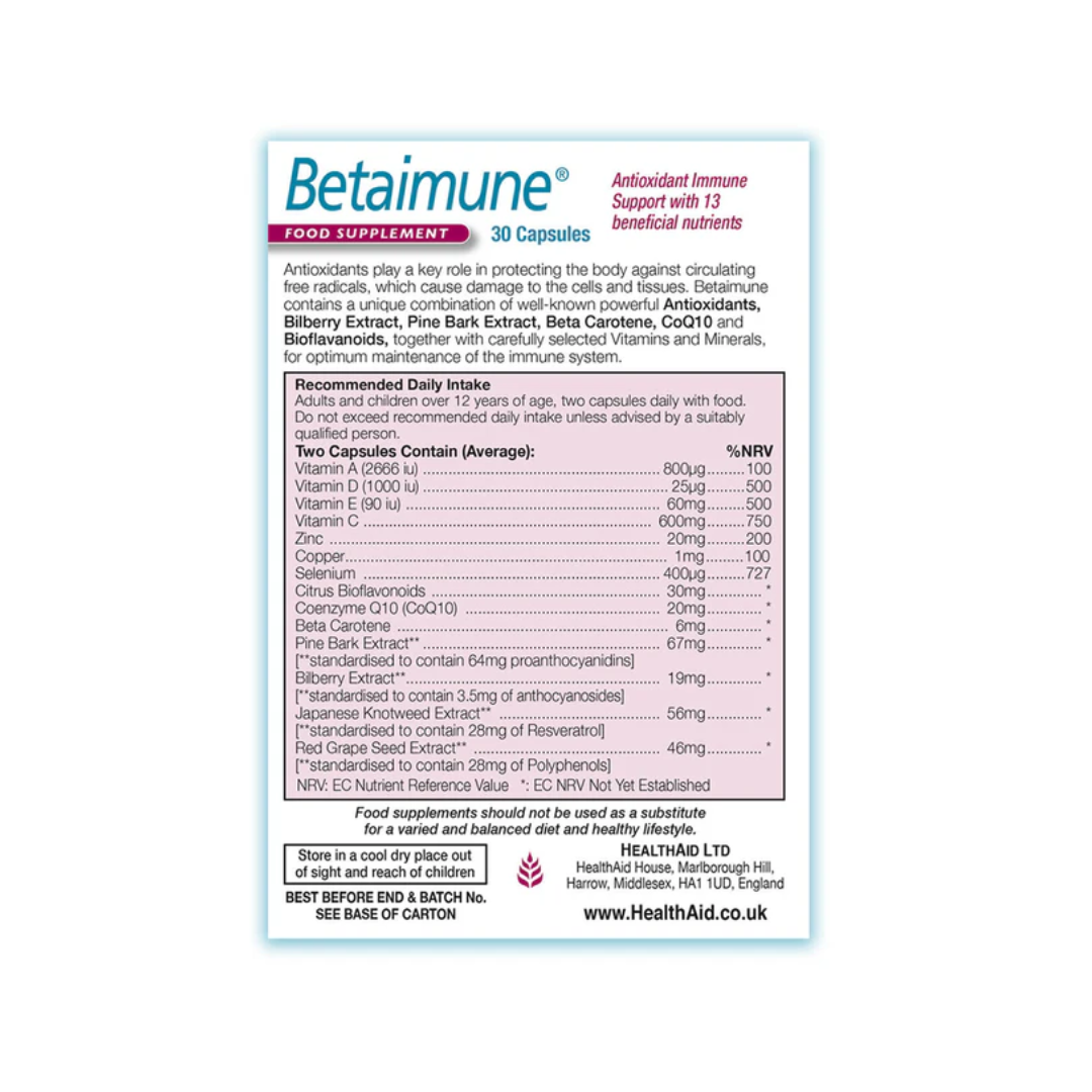 Capsule Shell [gelling agent (gelatine), humectant (glycerol, purified water), natural colour (black iron oxide)], Bulking Agent (soybean oil), Vitamin C (ascorbic acid), Sodium Selenite, Natural Vitamin E (d-alpha tocopherol), Pine Bark Extract, Citrus Aurantium Extract (providing citrus bioflavonoids), Red Grape Extract, Japanese Knotweed (Polygonum cuspidatum) Extract, Zinc Oxide, Emulsifier (beeswax, lecithin), Coenzyme Q10, Beta Carotene, Bilberry Extract, Copper Sulphate, Vitamin A Palmitate, Vitamin D3 (cholecalciferol).