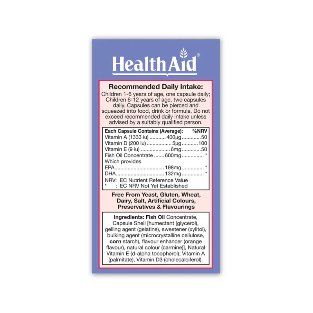 KidzOmega Capsules™ ofrojnë një burim të madh të acideve yndyrore esenciale Omega-3 EPA dhe DHA. Acidi eicosapentaenoic (EPA) dhe acidi docosahexaenoic (DHA) kontribuojnë në funksionin normal të zemrës , trurit dhe syve. KidzOmega Capsules™ është i pasur me vitamina A, D dhe E për të përforcuar shëndetin e fëmijës suaj.