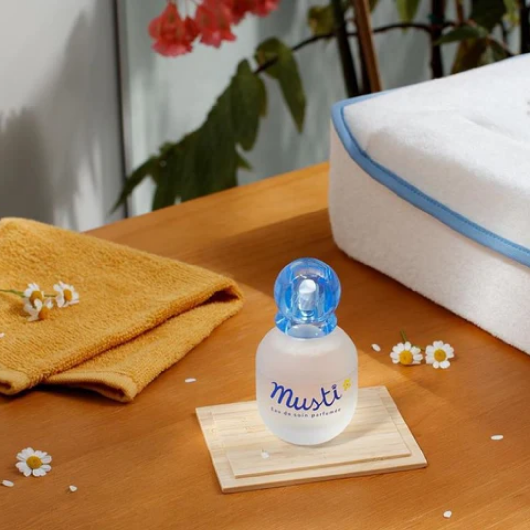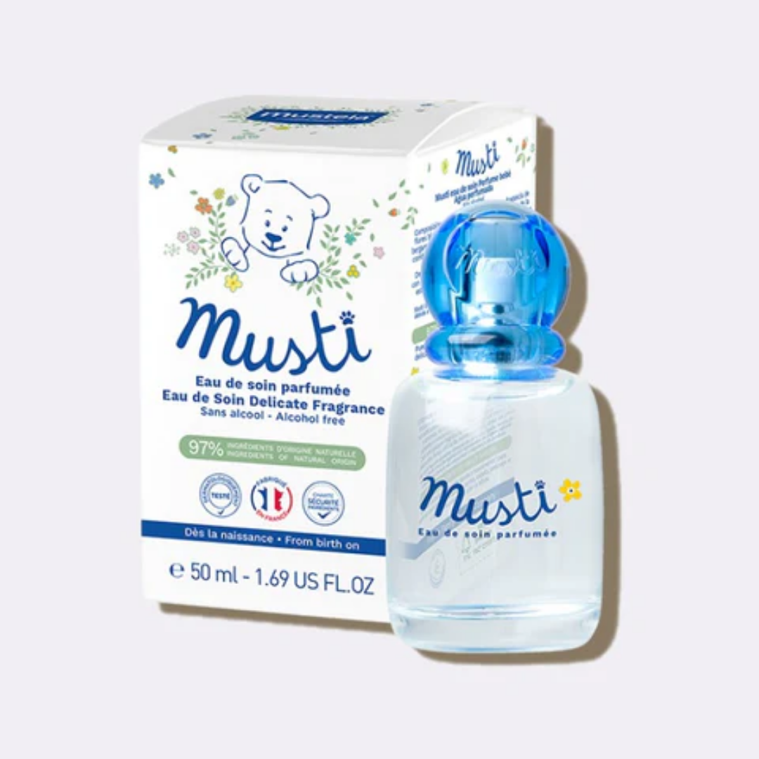 Ujë i parfumuar me aromën karakteristike dhe delikate të përkujdesjeve klasike Mustela, 50 ml