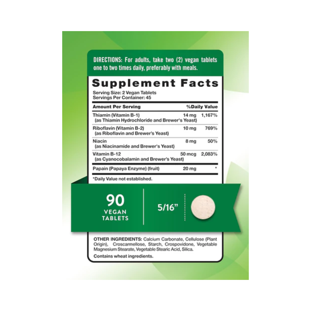 Calcium carbonate - filler, cellulose (from plant source) - stabilizer, stearic acid (from plant source) - lubricant, papain - papaya fruit enzyme, thiamin B-1, riboflavin B-2, croscarmellose - disintegrant, niacin B-3 , Vitamin B12, anti-caking agents - magnesium stearate (from plant source), silicon dioxide.