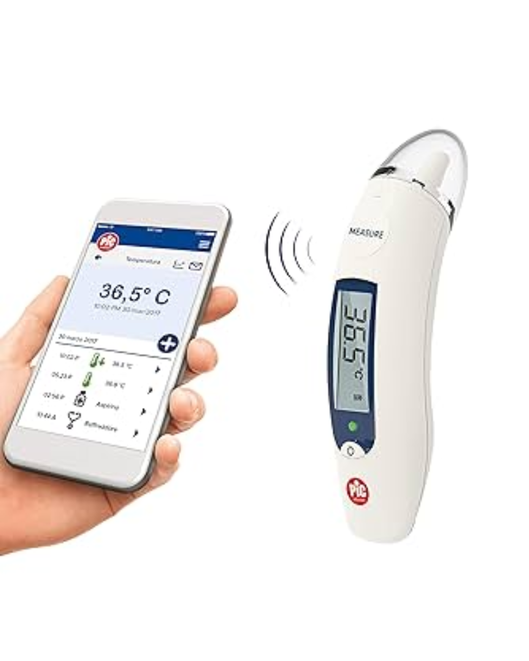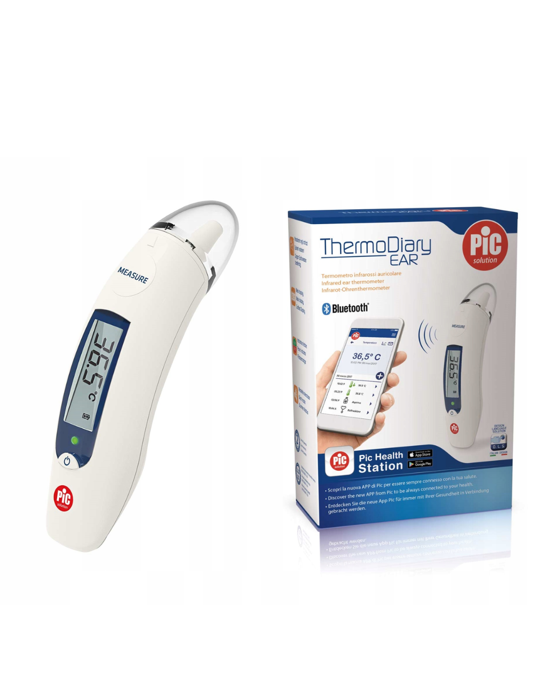 ThermoDiary Ear mund të sinkronizohet me Pic Health Station, aplikacionin Pic që regjistron, menaxhon dhe ndan të gjitha të dhënat dhe regjistrimet, për një ditar të temperaturës që është përgjithmonë i disponueshëm në telefonin tuaj .