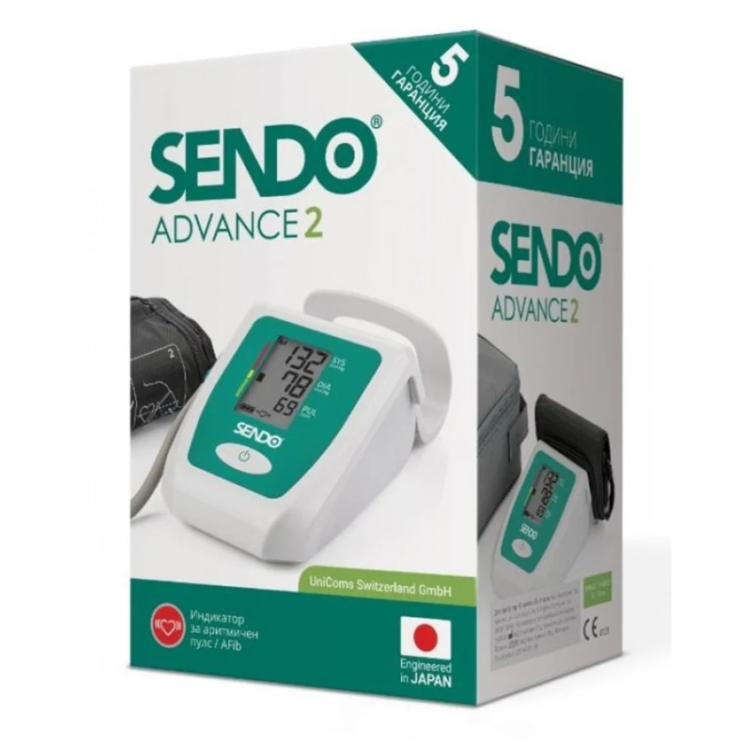SENDO ADVANCE 2 është aparat dixhital i presionit të gjakut, i krijuar për përdorim në shtëpi. Është i lehtë për t'u përdorur - me një buton. Ai mat presionin sistolik dhe diastolik të gjakut dhe pulsin, të klasifikuar sipas shkallës standarde të ngjyrave të OBSH-së. SENDO ADVANCE 2 është miratuar nga ESH (Shoqata Evropiane e Hipertensionit).
