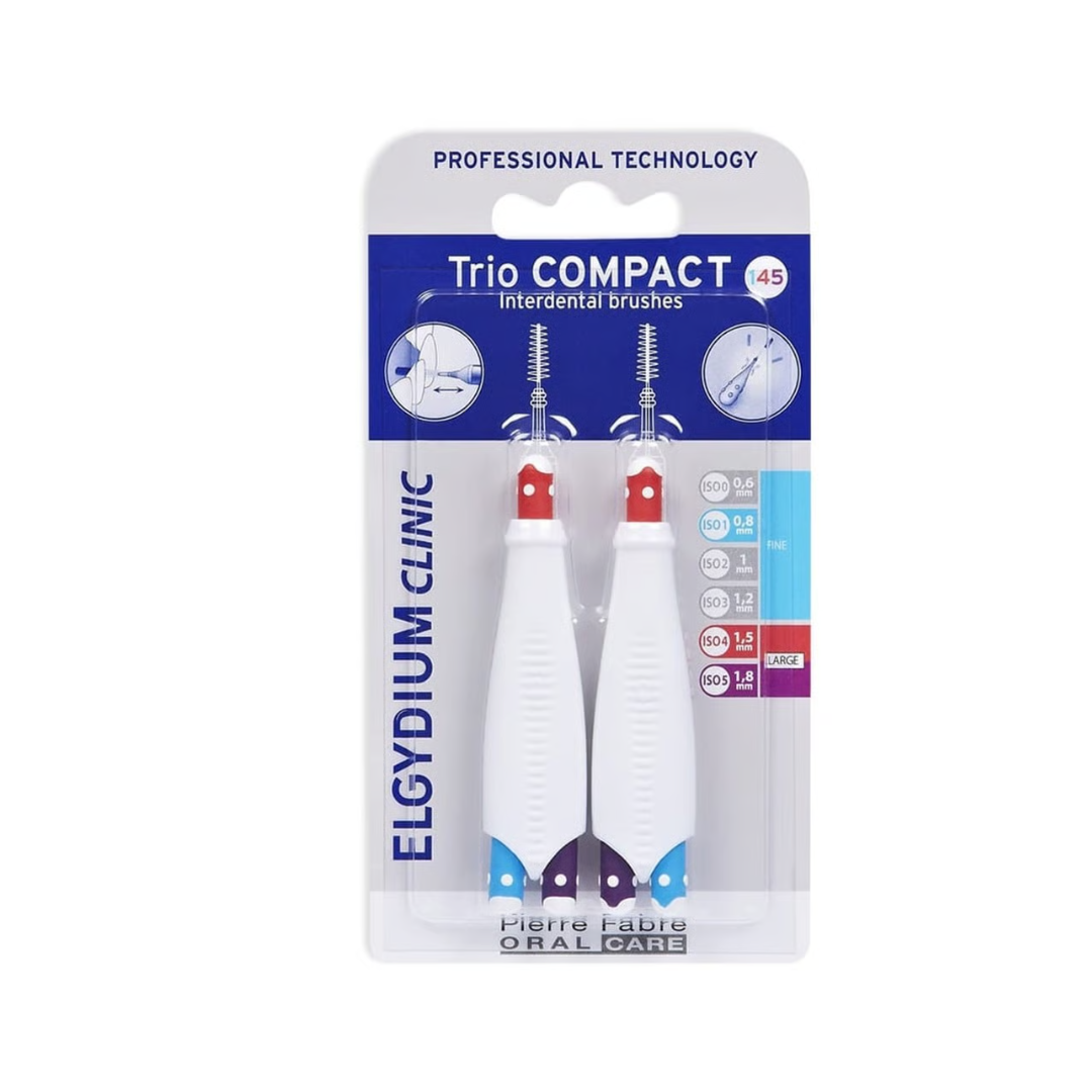 Të projektuara për pastrim efektiv ndërdhëmbor, furçat Ndërdhëmbore TrioCompact plotësojnë rutinat e përditshme të higjienës orale dhe rekomandohen veçanërisht për njerëzit me implante, pajisje ortodontike ose qafa dhëmbësh të ekspozuara. Përdorimi i tyre ndihmon në zvogëlimin e grumbullimit të pllakës, e cila është përgjegjëse për kavitetet dhe gingivitin, dhe përfshin një futje të thjeshtë dhe të butë të ndjekur nga disa lëvizje para-mbrapa. Fijet më të holla të zeza të furçës lehtësojnë futjen dhe ju lejojnë të shihni depozitat e pllakës të hequra. Fijet më të trasha të bardha zbulojnë gjakderdhje të rastit.