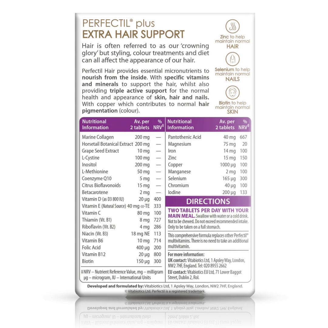 Bulking Agents: Calcium Carbonate & Microcrystalline Cellulose, Inositol, Horsetail Extract (Equisetum Extract), Marine Collagen (from Fish), Magnesium Hydroxide, Anti-Caking Agents: Silicon Dioxide, Stearic Acid & Magnesium Stearate, Tablet Coating (Hydroxypropylmethylcellulose, Purified Talc, Glycerin, Colours: Calcium Carbonate & Iron Oxides), L-Cystine, Vitamin C (Ascorbic Acid), Pantothenic Acid (as Calcium Salt), Vitamin E (D-Alpha Tocopheryl Acid Succinate) (from Soya), L-Methionine, Folic Acid (as Pteroylmonoglutamic Acid), Crosslinked Cellulose Gum, Ferrous Fumarate, Citrus Bioflavonoids, Potassium Iodide, Niacin (as Nicotinamide), Zinc Oxide, Biotin, Thiamin (Vitamin B1 as Mononitrate), Vitamin B6 (as Pyridoxine HCl), Betacarotene (Antioxidant: DL-AlphaTocopherol), Vitamin D3 (Cholecalciferol [Antioxidant: DL-Alpha Tocopherol]), Grape Seed Extract, Coenzyme Q10, Manganese Sulphate, Riboflavin, Sodium Selenite Triturate, Vitamin B12 (Cyanocobalamin), Copper Sulphate, Chromium Chloride. Allergy Advice: For allergens, see ingredients in bold.