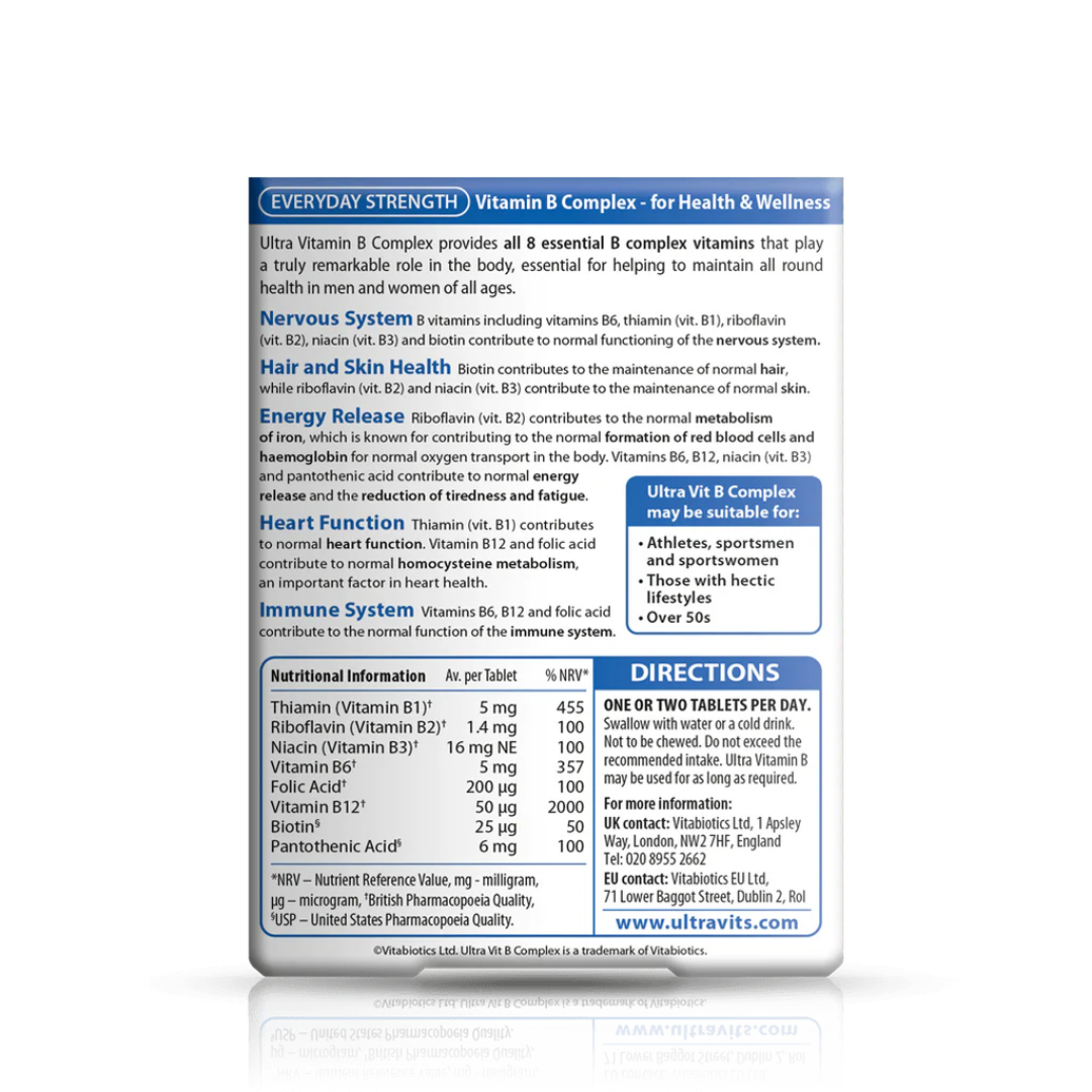 Ultra Vitamin B Complex nga Vitabiotics përmban të tetë vitaminat thelbësore të grupit B, të cilat luajnë një rol të rëndësishëm në trup. Ato janë thelbësore për ruajtjen e shëndetit të përgjithshëm, përfshirë shëndetin e flokëve dhe lëkurës, si dhe funksionimin normal të sistemit nervor.