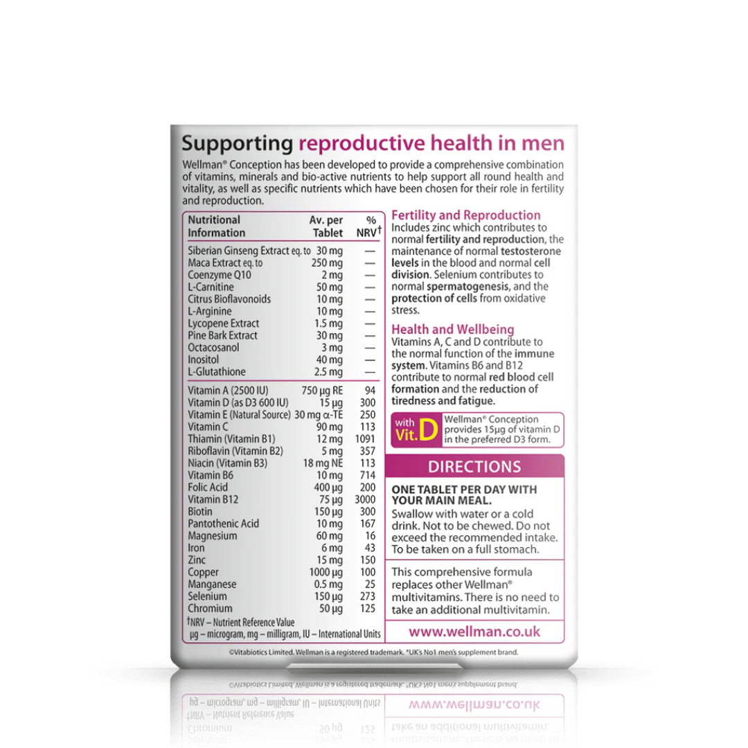 Maltodextrin, Bulking Agent: Microcrystalline Cellulose, Vitamin C (Ascorbic Acid [Hydroxypropylmethylcellulose & Tartaric Acid]), Magnesium Oxide, L-Carnitine Tartrate, Inositol (Carrier: Acacia Gum) Vitamin E (D-Alpha Tocopheryl Acid Succinate) (fromSoya), Maca Extract, Zinc Sulphate, Tablet Coating: (Hydroxypropylmethylcellulose, Glycerin, Colours [Iron Oxides]), Crosslinked Cellulose Gum, Pine Bark Extract, Anti-Caking Agents: Stearic Acid, Magnesium Stearate & Silicon Dioxide, Thiamin (Vitamin B1 as Mononitrate [Carrier: Hydroxypropylmethylcellulose]), Niacin (as Nicotinamide), Ferrous Fumarate, Citrus Bioflavonoids, Pantothenic Acid (as Calcium Salt), Vitamin B6 (Pyridoxine HCl), L-Arginine, Vitamin A (as Acetate [Carriers: Acacia, Starch, Maltodextrin, Antioxidants: DL-Alpha Tocopherol]), Vitamin D3 (Cholecalciferol [Carriers: Acacia, Sucrose, Corn Starch, Medium Chain Triglycerides, Antioxidant: DL-Alpha Tocopherol]), Siberian Ginseng Extract, Riboflavin, Octacosanol (Rice Bran), Copper Sulphate, L-Glutathione, Coenzyme Q10 (CoQ10), Manganese Sulphate, Lycopene Extract, Folic Acid (as Pteroylmonoglutamic Acid), Sodium Selenate, Chromium Trichloride, Biotin, Vitamin B12 (Cyanocobalamin).
